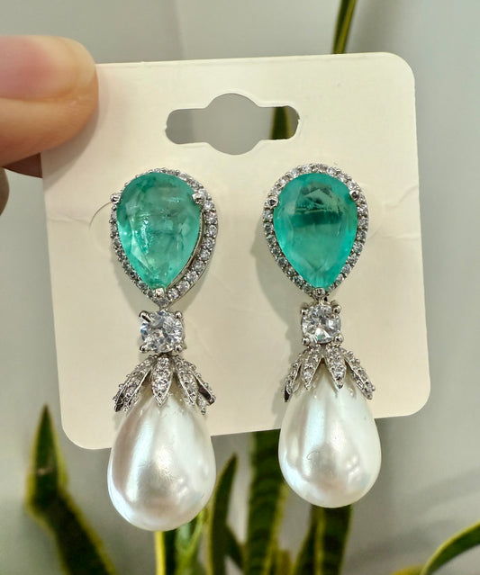 Teal Blue and Pearl Drop Long Earrings